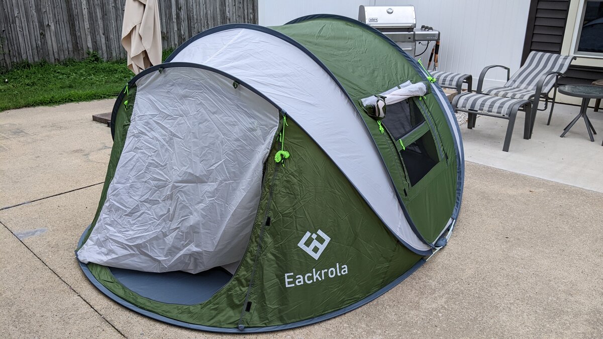 It simply pops up when unpacked. It takes a bit more when packing it up in the morning, but still can be done within a couple of minutes.