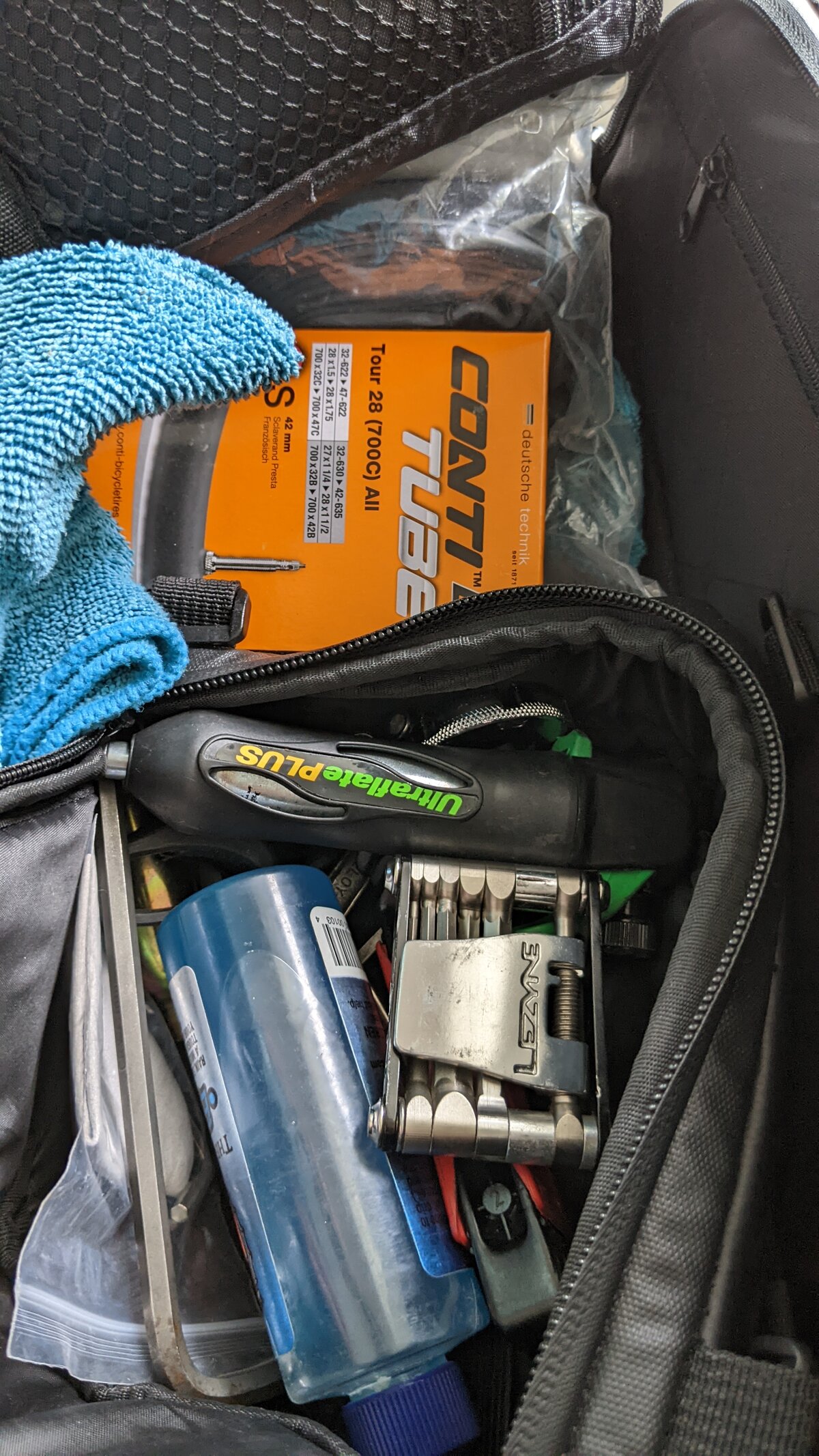 We also bought a trunk(!) for Ben’s bike a couple of months ago. This replaces a much smaller bag we had for tools. The trunk will give us plenty of room to carry bars, sunscreen, tools, rain gear, and whatever else we deem necessary.